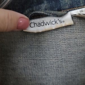 Chadwick's brand basic denim jacket. Front seam pockets, side tabs at waist, button cuffs. Bottom band is 21 1/2" across, waist area 19 1/2" across