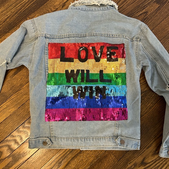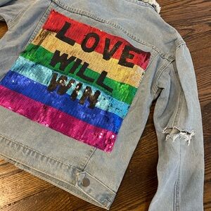 distressed denim jacket with sequin appliqué and crystals