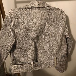 Jean jacket from Helmut Lang. Black patten pocket with zipper on the chest two rows of zippers and belt. Never worn
