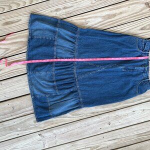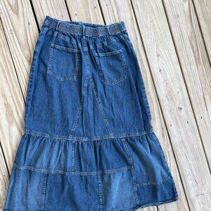 Denim maxi skirt, patchwork ruffle, tiered, size M, vintage, elastic waist. Excellent condition. See pics for measurements.