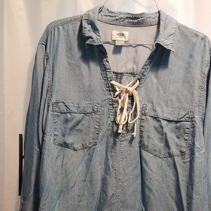 Hardly worn, denim style lace up top. It pulls over, not at all button up.