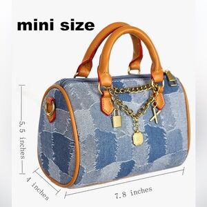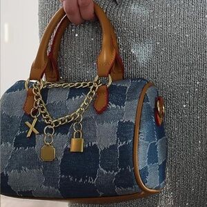 Denim patchwork mini barrel bag with charms and vegan leather handles