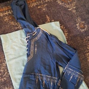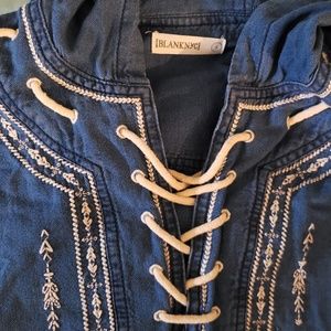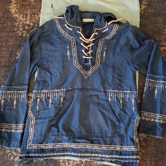 Tribal print , oversized lace up pullover , not real "denim material" , frayed hem , lightweight. Never worn