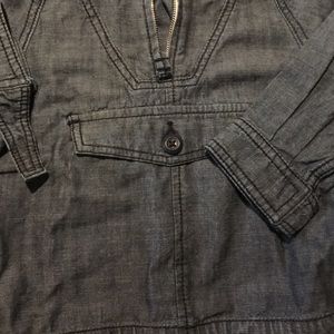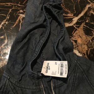 Toddlers light weight denim pull over hoodie jacket with a midway zipper n front pocket.