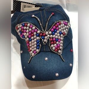 Blue denim white pink & blue multicolored pearl adorned rhinestones crystal trim butterfly baseball cap new