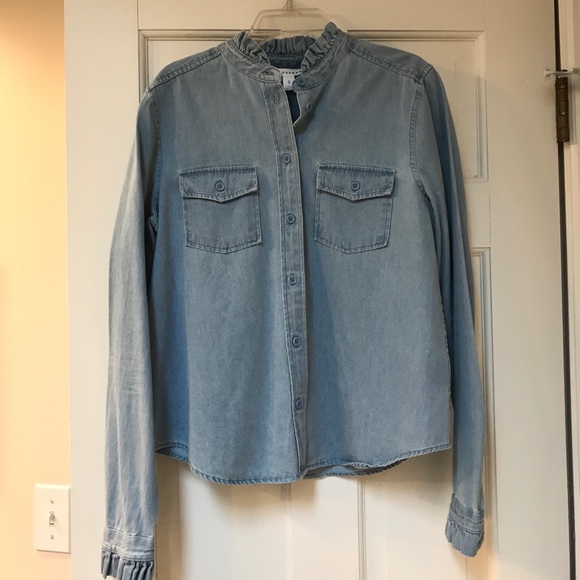 Women’s denim ruffle button up shirt. New without tags. Size S. Smoke and pet free.