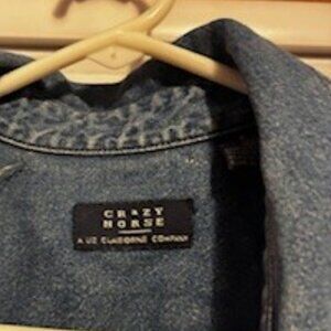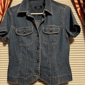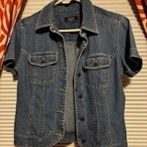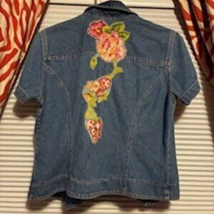 Denim short sleeve button down shirt with beaded floral design, Crazy Horse, SM