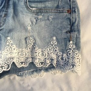 Low rise denim / jean shorts with lace trim. Gives the shorts a delicate and unique feel. Very comfortable fit true to size (I'm normally a four so they're a little tight on me)❗️shirt for sale, too❗️