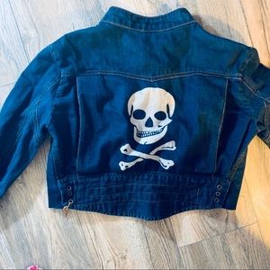Denim short jacket . Zipper ties on side if wrists in brown leather removed and on side if waist line