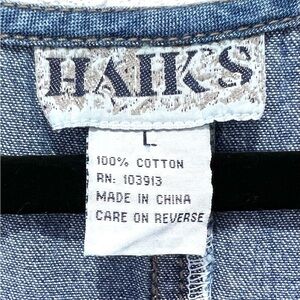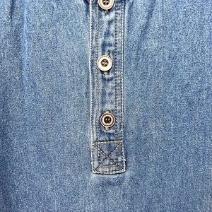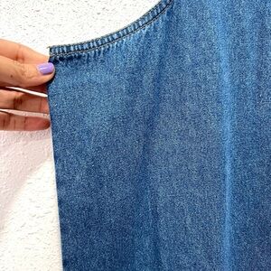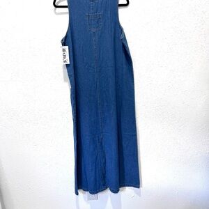 This is a new women's denim maxi dress in size large. It is sleeveless with a button-down front and patch pockets. The dress is made of 100% cotton denim and has a modest, casual style. It also has back slit for ease of movement. The dress is described as a maxi length, which means it falls to the ankles or lower.
