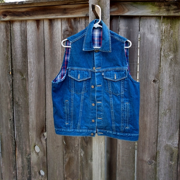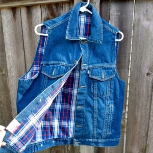 Flannel-lined denim vest. Four pockets. Button-up. Tag says W 40, equivalent to a large.