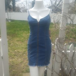 New with tags Adam Levine denim dress. Frayed hem line adjustable straps and zipper that goes from the bottom to the top. Size small