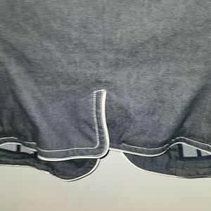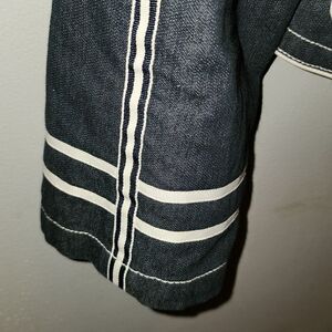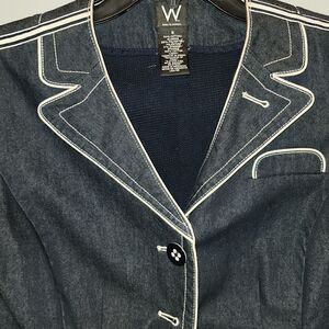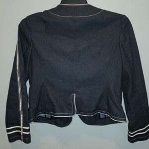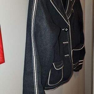 denim cropped blazer with 3 large butyon closure. detailed lapel stitching. 2 pockets cream piping