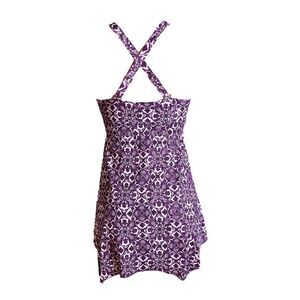 Features: printed, scoop neck, adjustable straps with S-hook, handkerchief hem, brief attached at waist seam