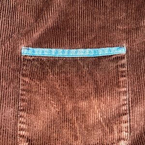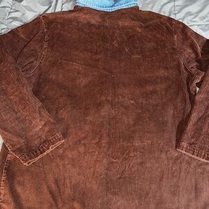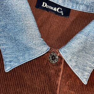 Chic brown corduroy jacket with stylish blue trim. Ideal for fall fashion. The size tag is cut out of size is women’s Large more oversized fit. Very comfy! Extremely beautiful brown corduroy with denim accents on the collar and front pockets. Brand is denim and co. This is an older style jacket. Gorgeous fall piece!!