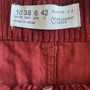 Stylish burgundy corduroy skirt with button-front. Features two front pockets. Perfect for versatile wear.