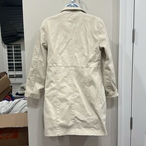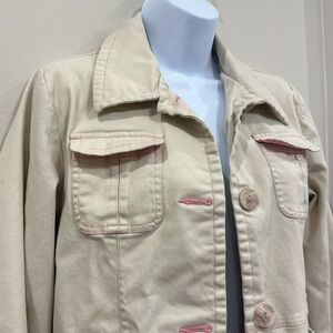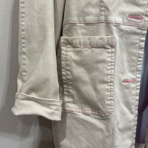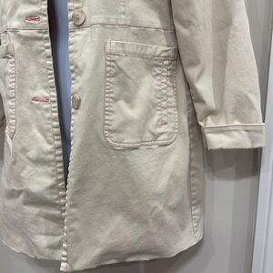 Stylish cream trench coat by Denim&Co. Features pink accents on buttons and pockets. Perfect for layering.