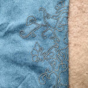 The solid, medium wash denim is accented with a tone-on-tone embroidered dot swirl design that wraps around the right side seam, with the embroidered "dots" resembling beading.