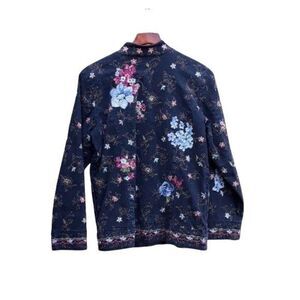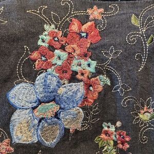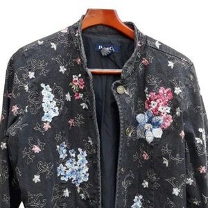 Denim & Co Jean Jacket Boho Novelty Whimsical Floral Embroidered Dark Wash Sz M
