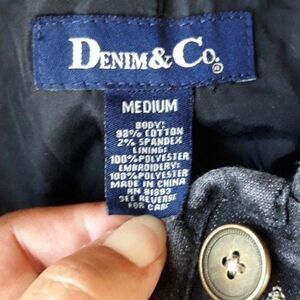 Cotton blend Embroidered jean jacket mandarin collared dark wash button down 2 pocket fully lined nehru jean jacket embellished with floral embroidery by Denim & Co. Beautiful statement piece.
