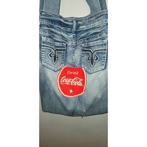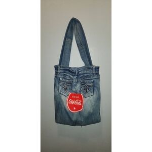 Denim handmade tote with Coca-Cola Fleece detailing functioning pockets 21' Tall 18" Wide 16" double carry straps
