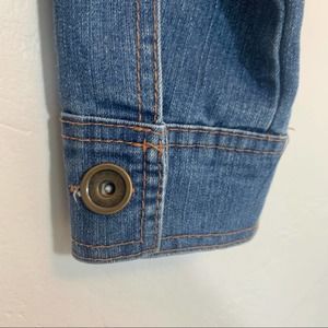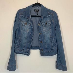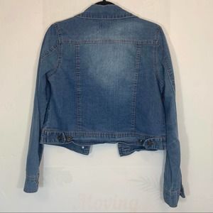 Cute denim/jean jacket in size medium. Sleeves can fold up, pockets on front, soft material, Runs a bit small, if you need measurements please let me know!