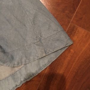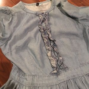 Cotton, light weight shirt waisted dress. 3/4 length sleeves, zipper on side, button up front with ruffles. Flirty and fun, washed denim look but very soft. Runs small, hits mid thigh. Gently used