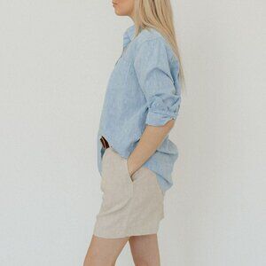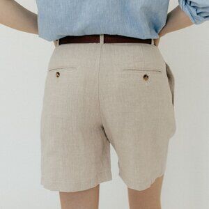 Denimist Double Pleat Shorts. Crafted from linen, these lightweight shorts offer both breathability and sophistication. The double pleat design adds a touch of luxury, while the mid thigh length complements any figure.