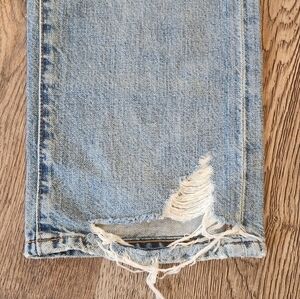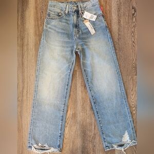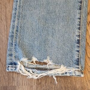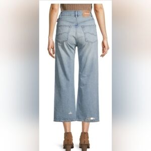 Cropped wide legs, runs small fits more like 23. Distressed hems.