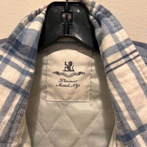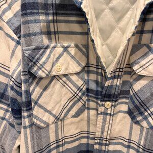 Features: Soft cotton fabrication with plaid print all over, classic collar, button-front closure, rounded bottom hem, quilted lining, chest-pocket detail