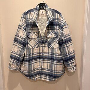 Cool and classic shirt jacket is featured in an oversized, slouchy silhouette and plaid fabrication with quilted lining for added layer-ability.