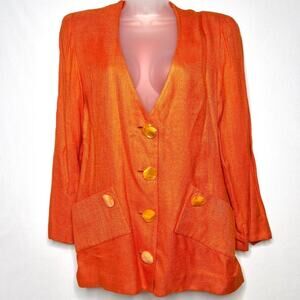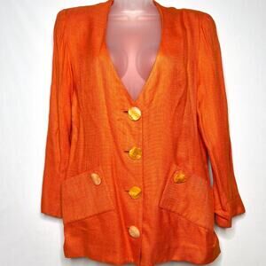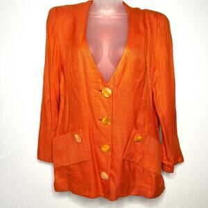 Vintage Denise Hajjar Boston bright and bold orange woven linen blazer with large swirled orange circle buttons on the front and the pockets. Has large shoulder pads, deep v neck, and large open front pockets. A couple small spots on sleeve but otherwise in great condition. No size tag but seems to be a medium or size 8. Please check measurements! Tag says dry clean only.