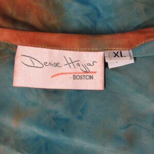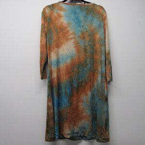 Denise Hajjar Boston Tie Dye Art to Wear Artsy Tunic Dress Made in the USA sz XL. Blues, greens, orange. 3/4 sleeves. Stretchy poly/spandex.