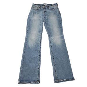 The Denizen Levi's Women's Blue Jeans in size 4 are designed for a curvy slim fit, featuring a flattering flare leg style. Made from a comfortable cotton blend denim with a light wash, these jeans include a zip and button closure, mid-rise waist, and a 5-pocket design. Machine washable and suitable for all seasons, these slimming and stretchy jeans are a stylish and versatile addition to any woman's wardrobe.