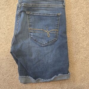 Trendy distressed jean shorts. Classic blue denim. Perfect for casual wear.