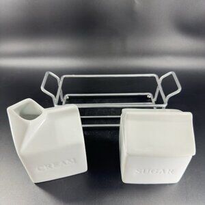 Denmark Sugar And Creamer Set 2 Vitrified Porcelain White Ceramic W Metal Rack
