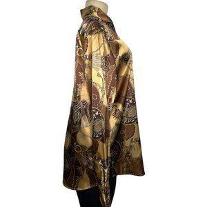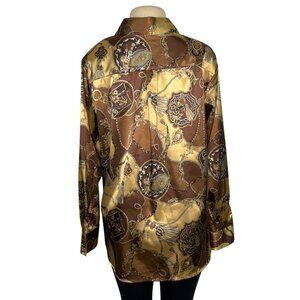 Dennis Basso Chain Print Satin Button-Up Shirt Brown/Gold Size L