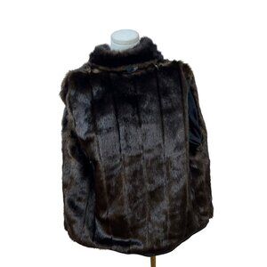 This large-sized denim jacket for women combines timeless design and cozy functionality. It features a dark wash denim body accompanied by luxurious brown faux fur trims on the collar and cuffs for added style. The gold-tone buttoned front complements the elegant look of the jacket, while two chest pockets and tailored stitching enhance its casual utility. With no flaws or defects, this versatile piece is in excellent condition.