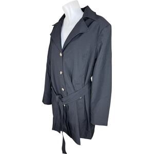 This item is a Dennis Basso Regular Water Resistant Trench Coat with Hood in the color Black. It is a size Large. This item has never been worn. It does not have attached tags but does have the original packaging that it came with. I opened the packaging in order to take photos and measurements for this listing.