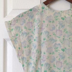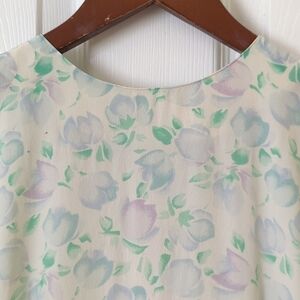 VTG and straight out of the 80s - This adorable dress is sleeveless with a bit of a drop shoulder, a round neck, and a zipper closure up the back. It has a midi length, falling mid calf, and an a-line silhouette that is fitted at the top and flowy in the skirt. It's lightweight, breathable, and comfortable with a flattering fit. It is cream in color with a light purple, green, and blue floral print. Great to pair with flats for a complete retro look. Very simple, classic, and perfect for Spring and Summer. Great addition to any wardrobe! So cute, unique, and fun! Very rare!