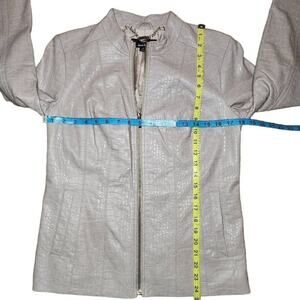 Excellent, used condition, size XS. Bone grey faux leather blazer jacket with band collar. Please see pics for details and measurements. Last 2 pics note a small tear on interior band collar and near left underarm. Gently worn. Smoke-free, ask any questions. Shop my closet for more great items: BUNDLE, BUNDLE, BUNDLE for discounts!!!