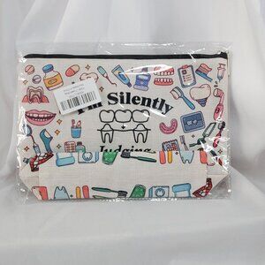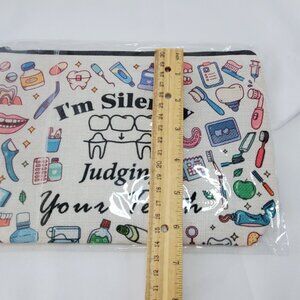 This dental-themed cosmetic bag features a playful "I'm Silently Judging Your Teeth" design. Ideal for organizing small items, it's both practical and eye-catching.