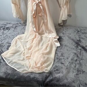 Romantic and elegant, this Dentelle “Belle” robe is designed in a soft blush-peach sheer fabric with delicate embroidered floral accents at the shoulders. Features long, flowing sleeves with ruffle cuffs, a satin tie waist, and lightweight drape for a timeless feminine look.