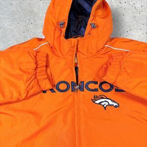 This Denver Broncos NFL Hooded Puffer Jacket in size Large features the iconic orange color and embroidered logo of the team. Officially licensed by the National Football League