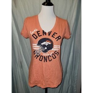 Size medium, team apparel tee Denver broncos. Had a small stain, about the size of my pinky finger. But no holes. Smoke free home.