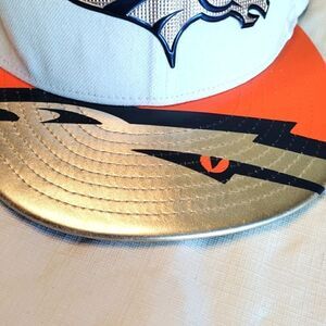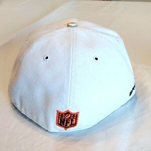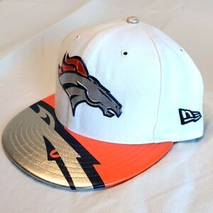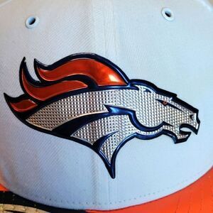 White, navy blue, and orange Denver Broncos fitted hat. In very good condition, some minor flaws ma exist. No major flaws see photos for details.