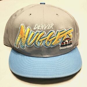 Grey and baby blue Den er Nuggets snapback hat. All embroidered with retro Nuggets logo. Hardwood Classic. In good condition. No major flaws. See photos for details.