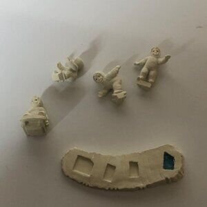 A vintage collector's treasure, this set features five charming Snowbabies figurines. Exquisitely crafted, it captures a delightful scene of playful camaraderie, embodying nostalgia and warmth. Perfect for those seeking charming and unique additions to their vintage collection, it offers a glimpse into timeless artistry.