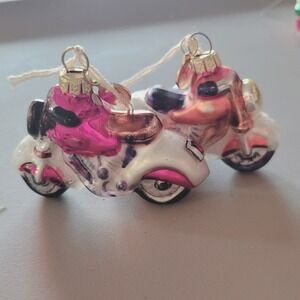 Adorable motorcycle Christmas tree ornament, a delightful addition to your holiday decorations. This charming ornament features a motorcycle design with pink and silver accents. The reflective properties of the glass enhance its visual appeal, making it a standout piece on any Christmas tree or holiday display. Ideal for motorcycle enthusiasts or anyone looking to add a touch of novelty to their festive decor, this ornament brings a unique and playful element to your holiday celebrations.