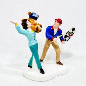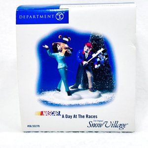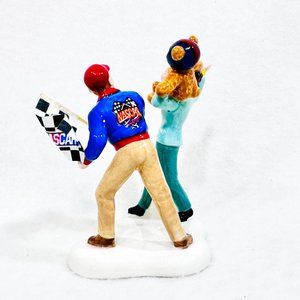 Department 56 Snow Village Accessory, " A Day at the Races" Nascar. Retired in 2006. This is a single unit with two people on it, as in photos. The box is intact. The sleeve shows minor wear from storage and handling. No chips or cracks.